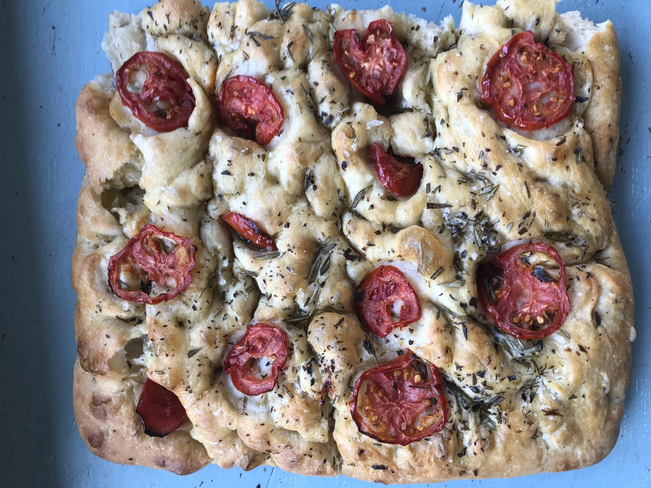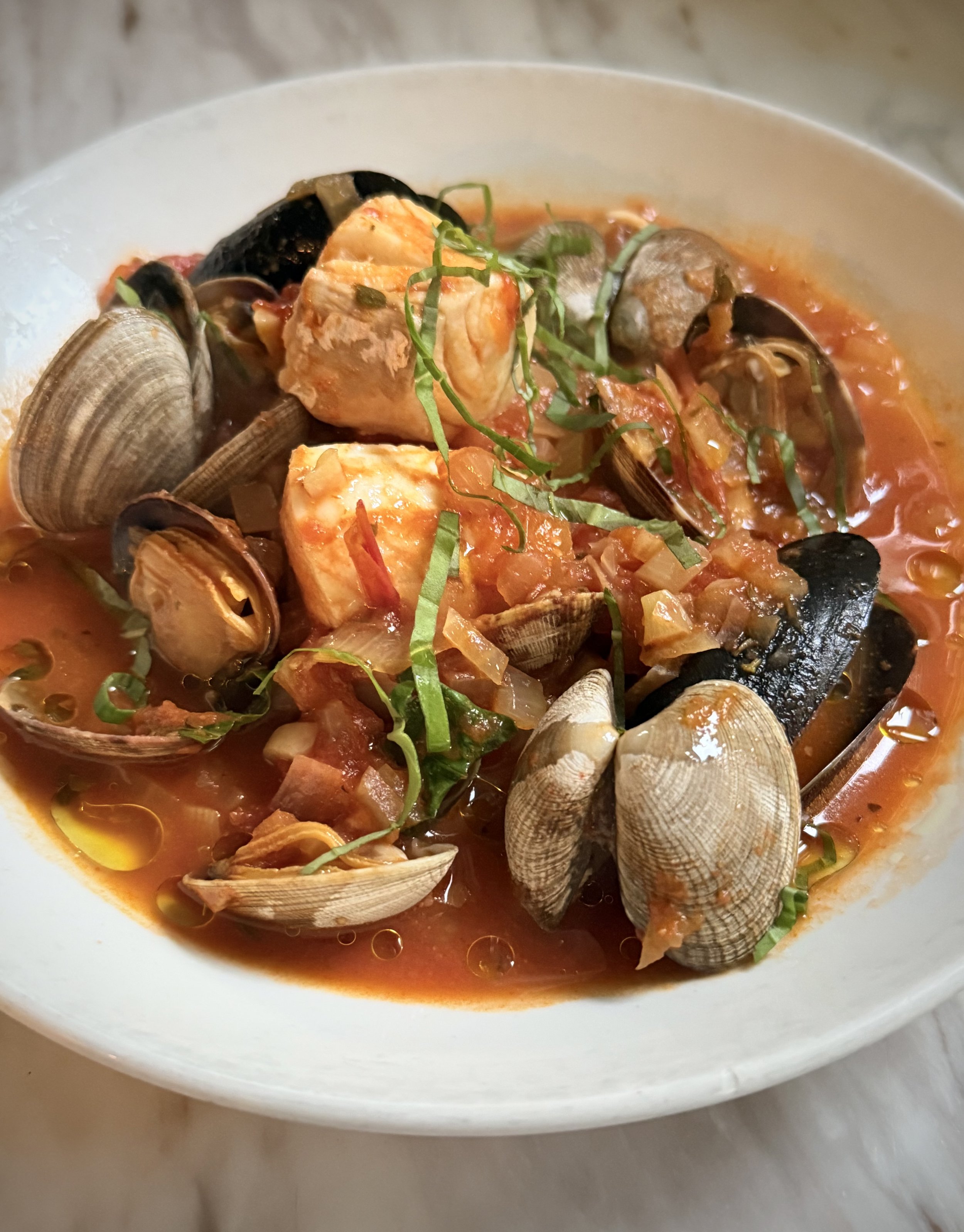 Halibut in ‘Crazy Water’ – Halibut poached with Heirloom Tomatoes, Garlic, Calabrian Chile, Fresh Herbs