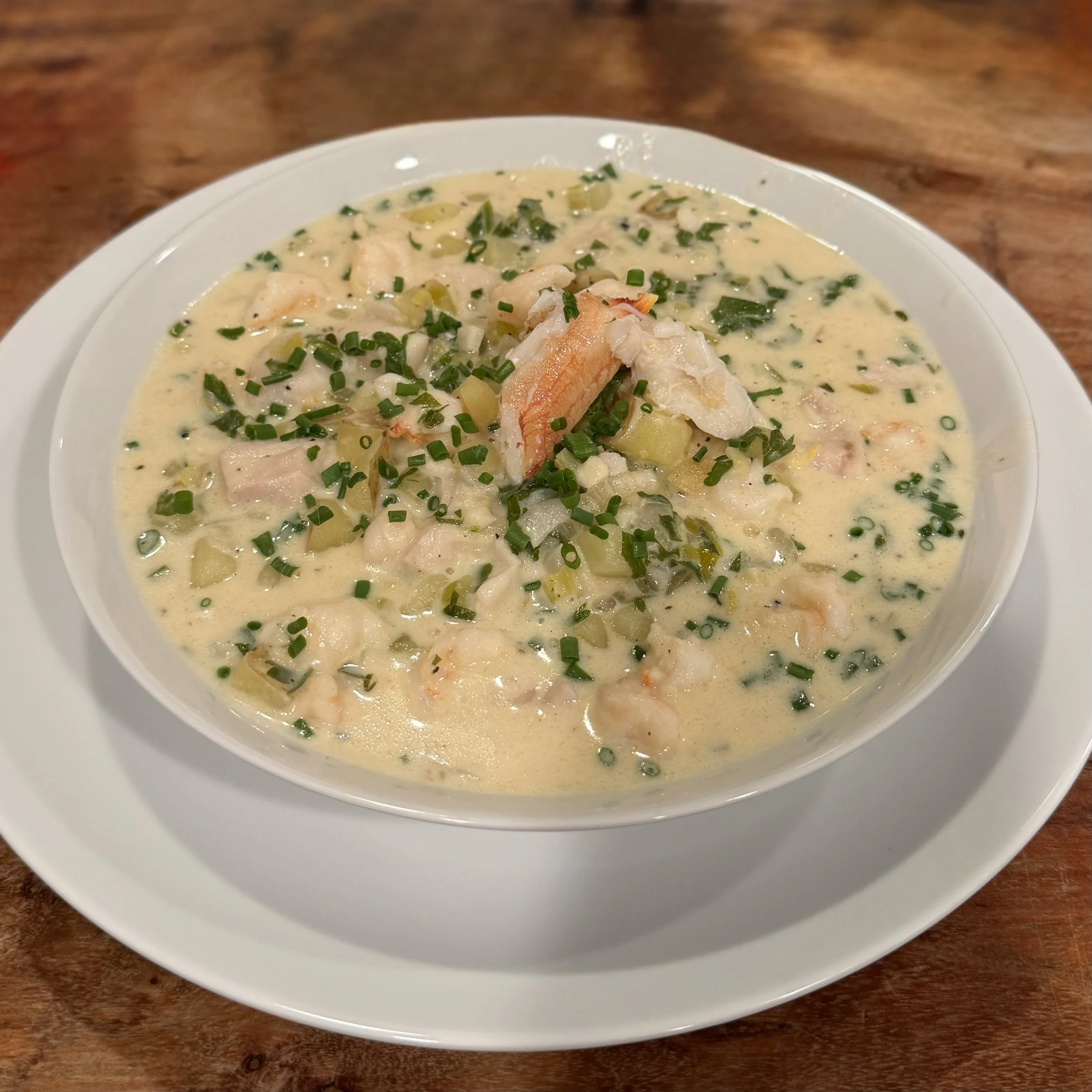 Salmon Chowder, Bacon, Sweet Corn, Potatoes, Onions, Celery, Dill Chives