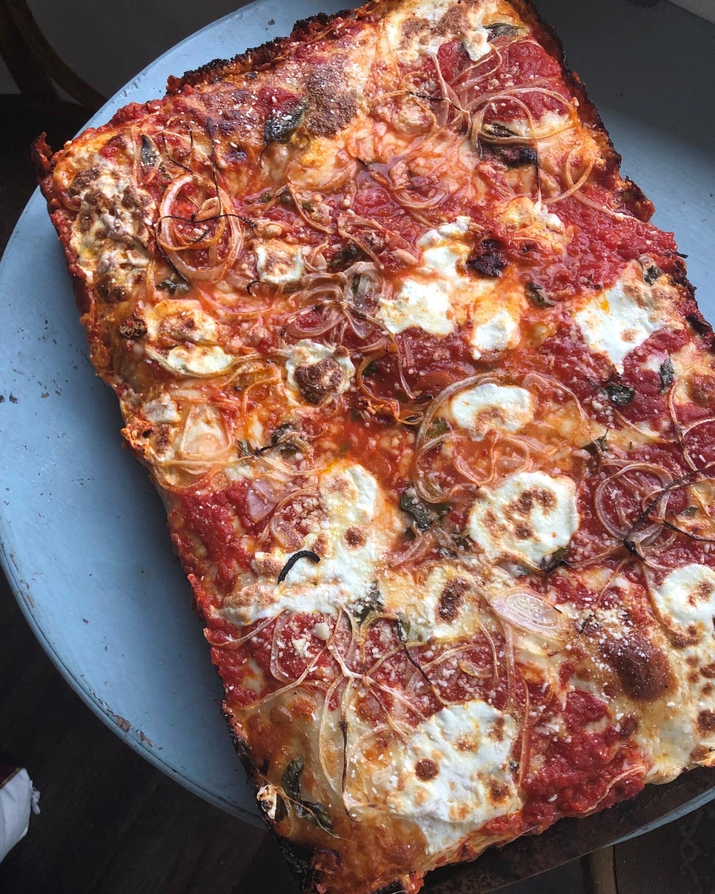 Detroit Pan Pizza, Tomato Sauce, Smoked Provolone, Arugula, Burrata