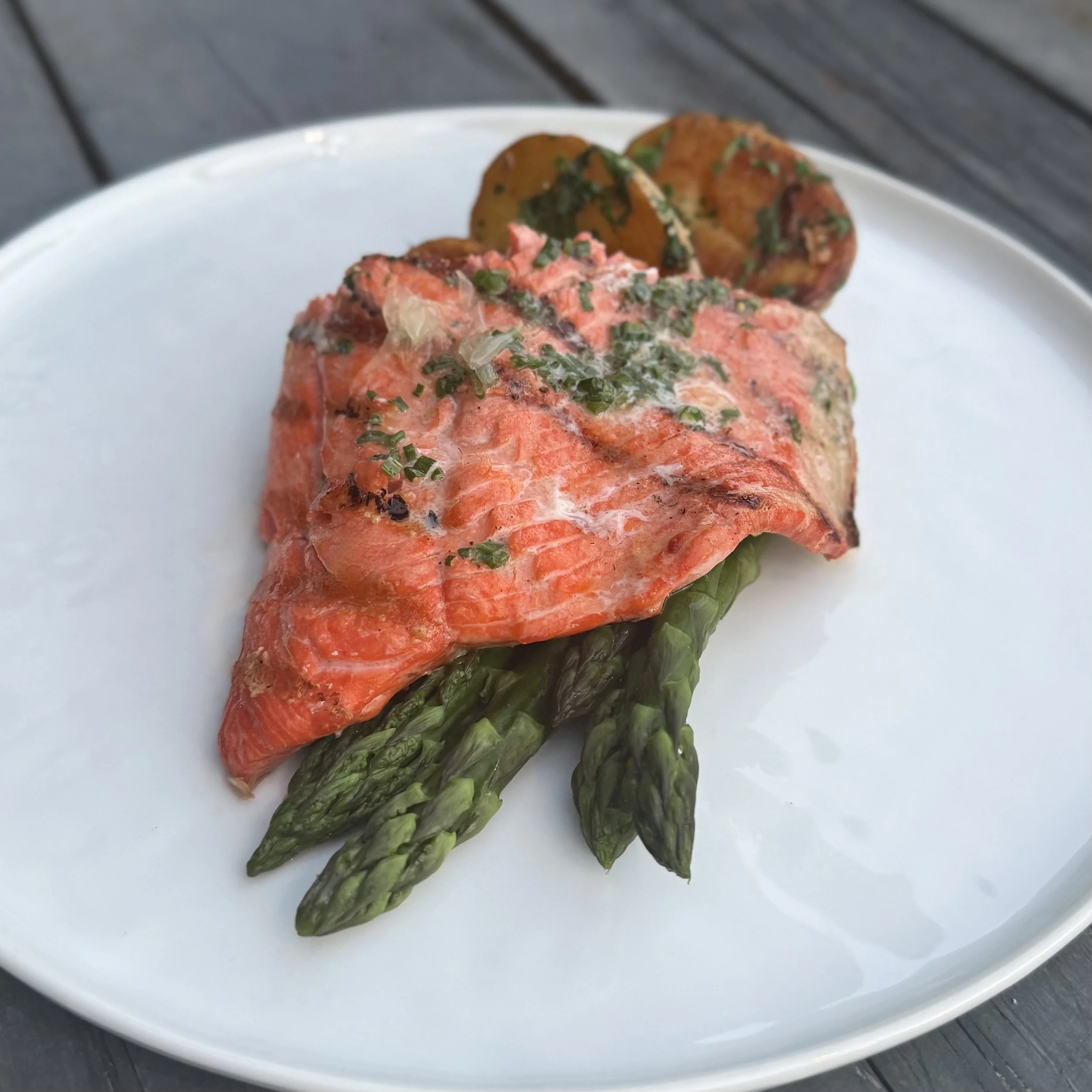 Grilled Salmon, Blanched Asparagus, Herbed Potatoes, Chive Butter